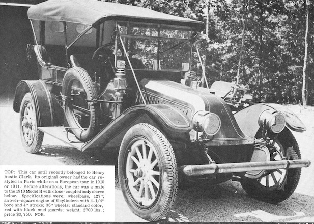 ACN #8 of August 1955 contained a photo of the car in its first modified form noting that the car recently belonged to Henry Austin Clark. It shows the car with the "shovel-nose" hood on it, but still carrying the original cowl. "This car until recently belonged to Henry Austin Clark, Its original owner had the car re-styled in Paris while on a European tour in 1910 or 1911. Before alterations the car was a mate to the 1910 Model H with close-coupled body shown below. Specifications were: wheelbase, 127"; an over-square engine of 6 cylinders with 4-1/4" bore and 4" stroke, 36" wheels, standard color, red with black mud guards, weight, 2700lbs.; price $3,750. FOB"